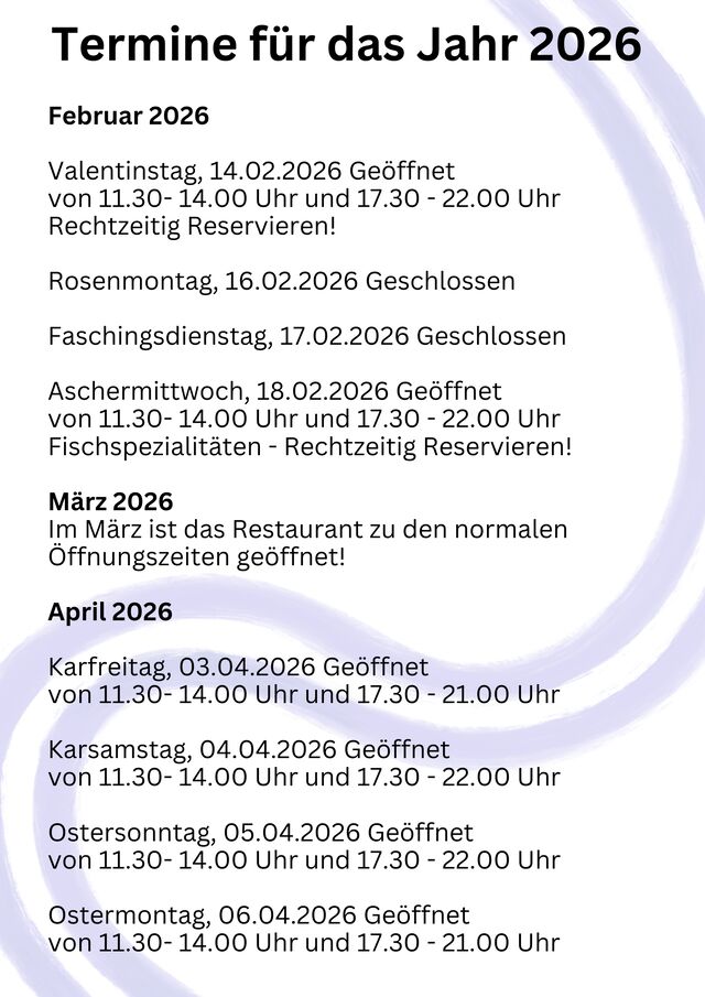 Im März ist das Restaurant zu den normalen Öffnungszeiten geöffnet!